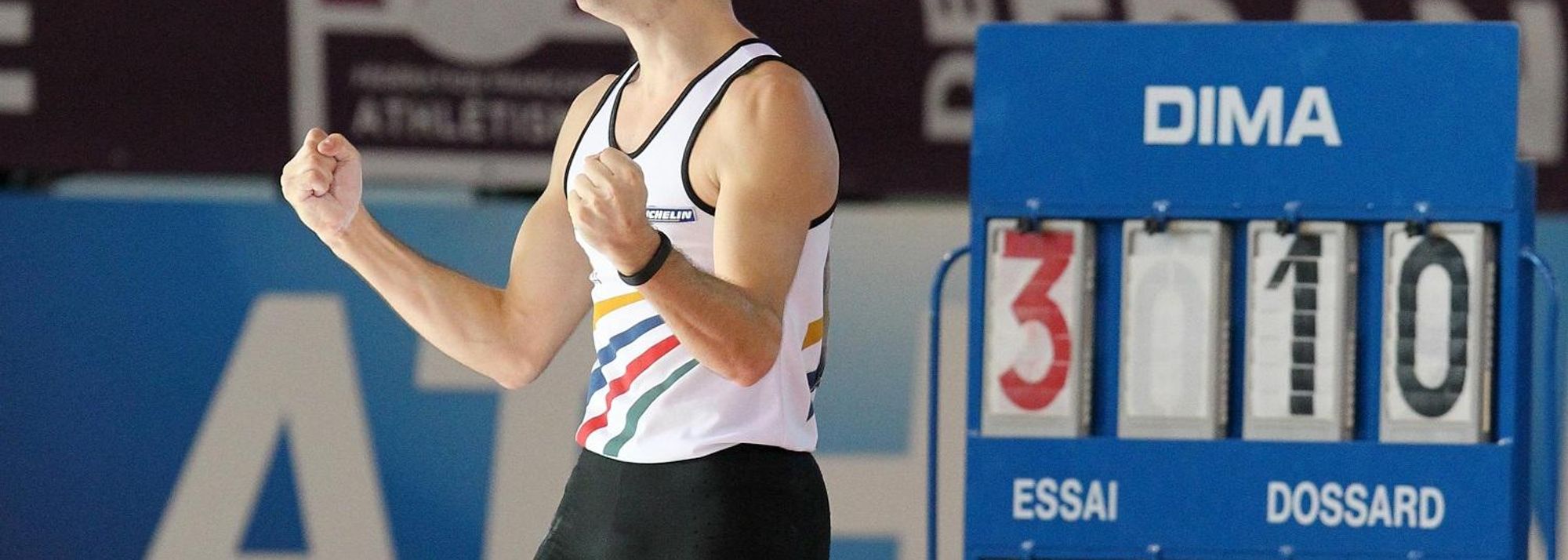 Renaud Lavillenie after clearing 5.93m at the 2013 French indoor championships (© Jean-Pierre Durand)