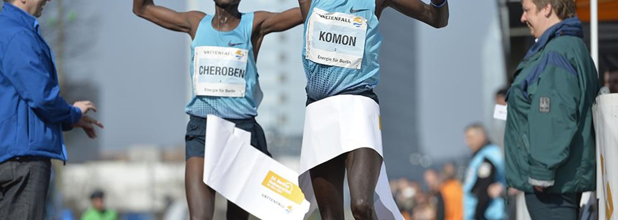 In his debut at the distance, Leonard Komon won the 34th Vattenfall Berlin Half Marathon with the world class time of 59:14, just edging out fellow Kenyan Abraham Cheroben in a sprint finish on Sunday (30).
