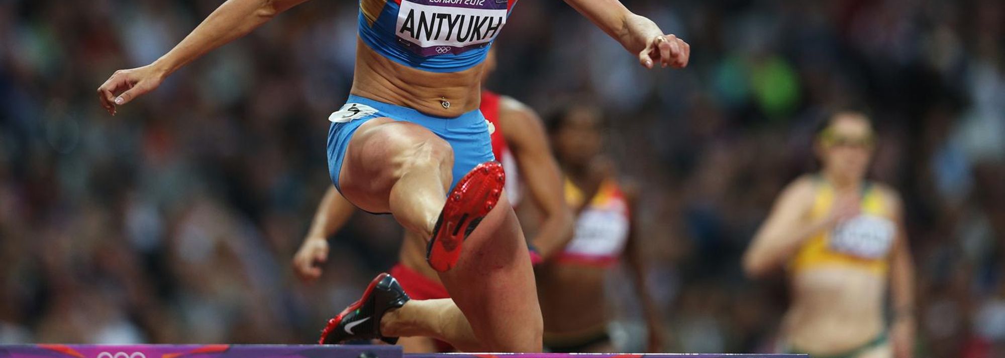 Natalya Antyukh of Russia jumps a hurdle in the Women's 400m Hurdles semi final on Day 10 of the London 2012 Olympic Games at the Olympic Stadium on August 6, 2012 (© Getty Images)