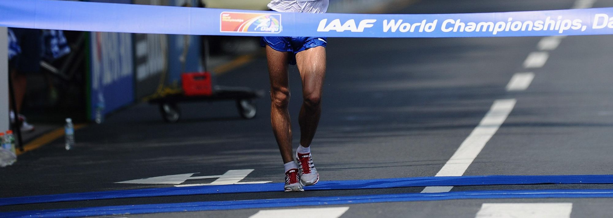 Daegu, Korea - Valeriy Borchin raised arms aloft, then crossed himself as he crossed the line in 1:19:56 to retain his World title after a ruthless exhibition of race walking in which he had made a decisive break shortly before the 15km point.