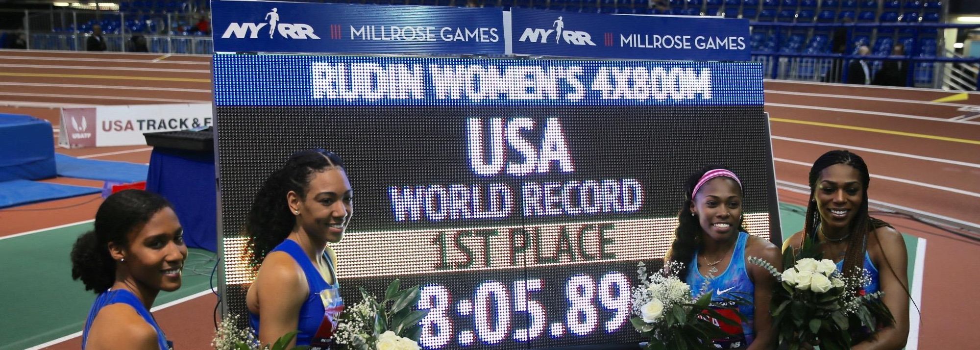 A USA quartet broke the world indoor record* in the women's 4x800m to highlight the 111th edition of the NYRR Millrose Games in New York on Saturday (3).