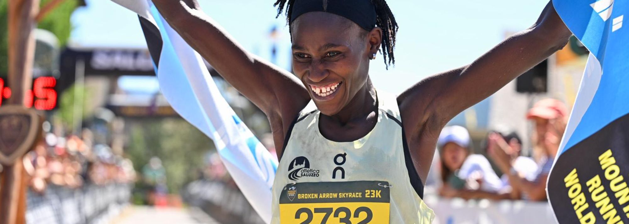 Joyce Muthoni Njeru celebrates her Broken Arrow Skyrace win (© Scott Rokis)