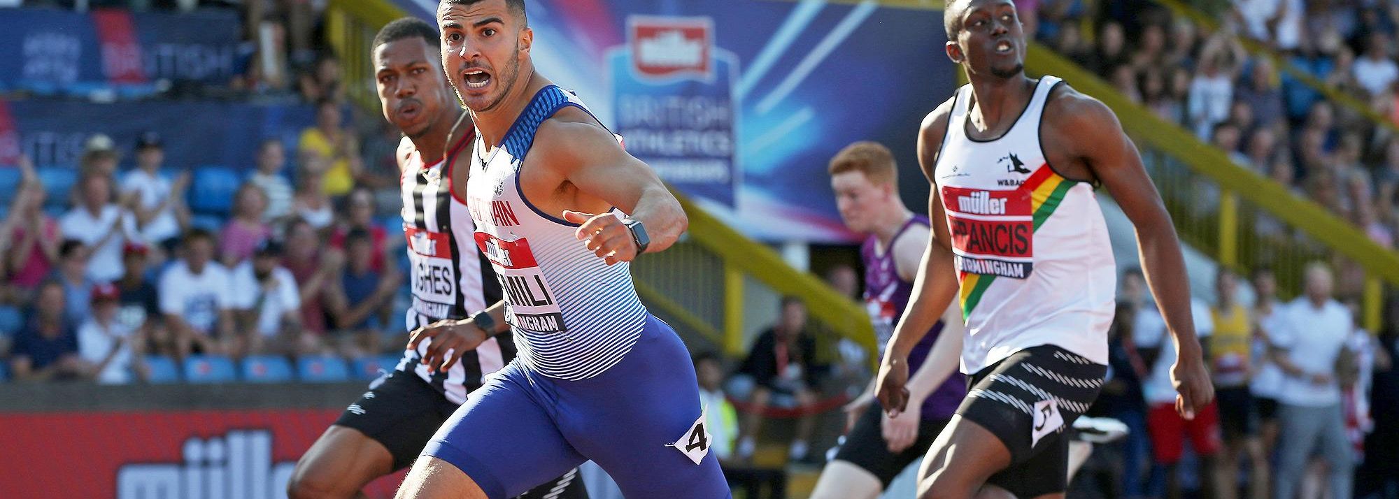 Gemili and Hughes returned to the track 24 hours later for the 200m final. Despite another strong headwind – this time -1.2m/s – Gemili won in a championship and stadium record of 20.08, his fastest time since his PB run of 19.97 in September 2016.