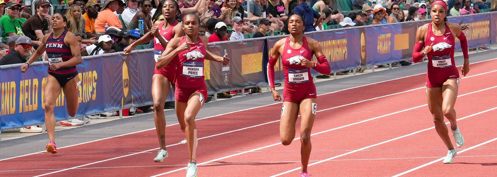 Nickisha Pryce created history in numerous ways on the final day of action at the NCAA Championships in Eugene on Saturday (8).