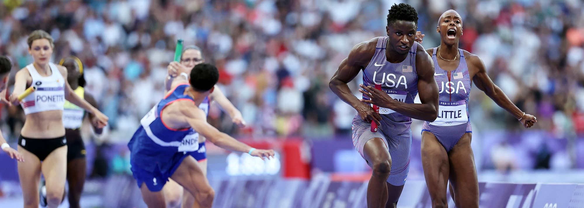 The US team on the way to a mixed 4x400m world record at the Paris 2024 Olympic Games (© Getty Images)