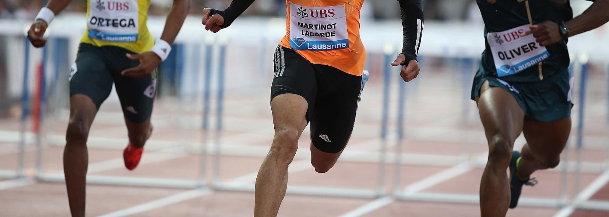 Pascal Martinot-Lagarde winning the 110m hurdles at the 2014 IAAF Diamond League meeting in Lausanne (© Giancarlo Colombo)