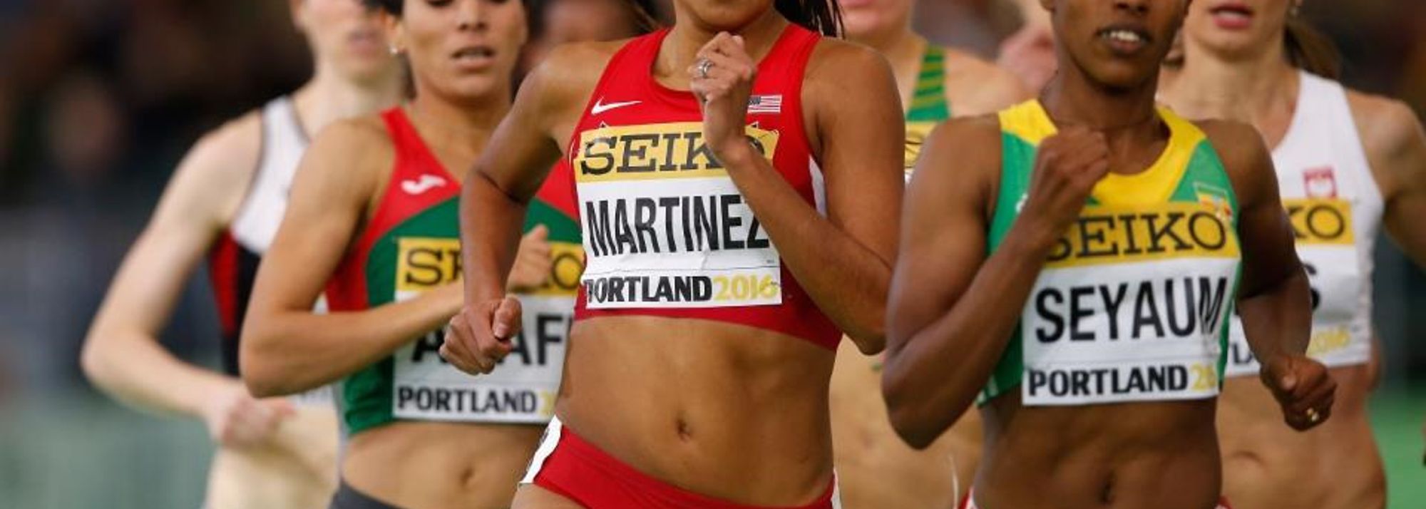 Dawit Seyaum and Brenda Martinez in the 1500m heats at the IAAF World Indoor Championships Portland 2016 (© Getty Images)
