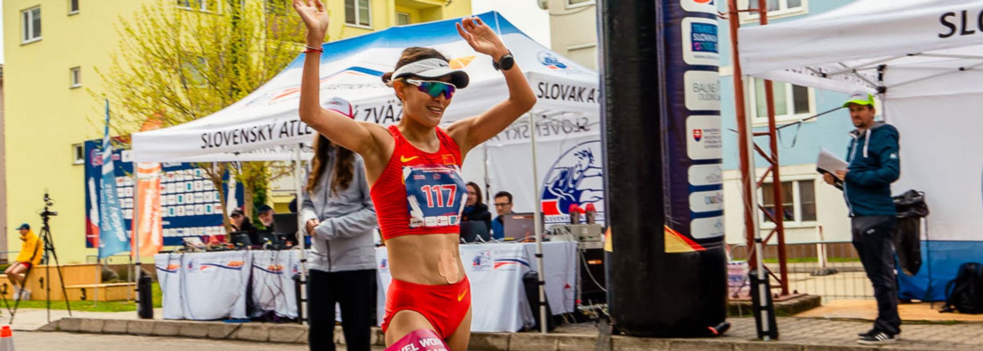 Qieyang Shijie celebrates her 35km race walk win at the Dudinska 50 (© Milan Duroch)