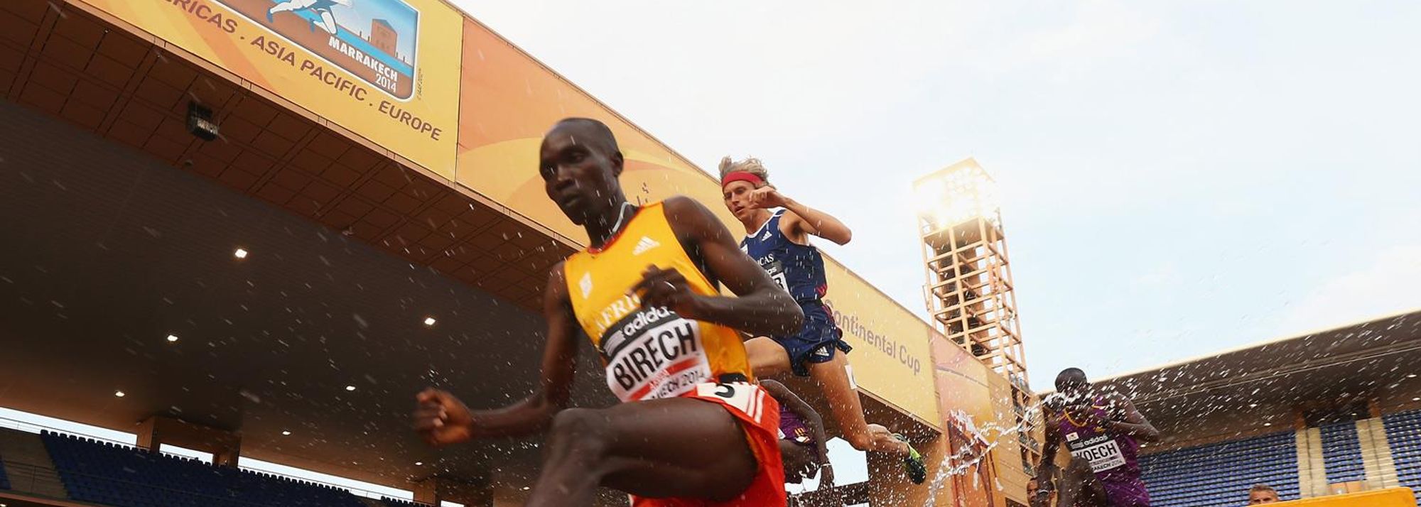 Jairus Birech on his way to victory in the 3000m steeplechase at the IAAF Continental Cup, Marrakech 2014 (© Getty Images)