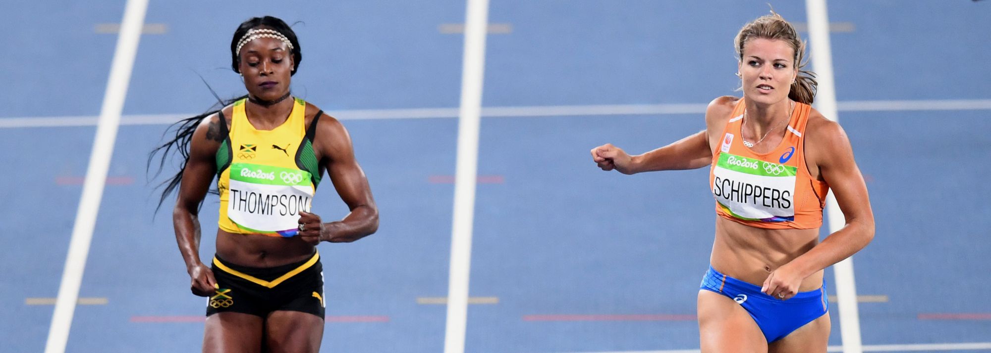 Elaine Thompson and Dafne Schippers in the 200m semi-final at the Rio 2016 Olympic Games (© Getty Images / AFP)