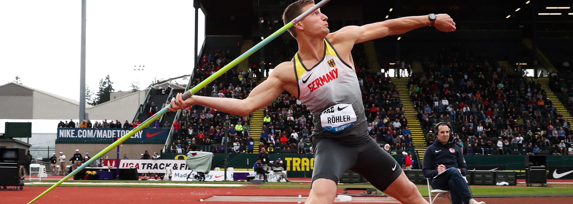 On Friday night, the javelin took centre stage with @thomasroehler coming out on top once more. The German Olympic champion loved the attention from the @nikepreclassic crowd.#EugeneDL pic.twitter.com/JgBWZDfQB4