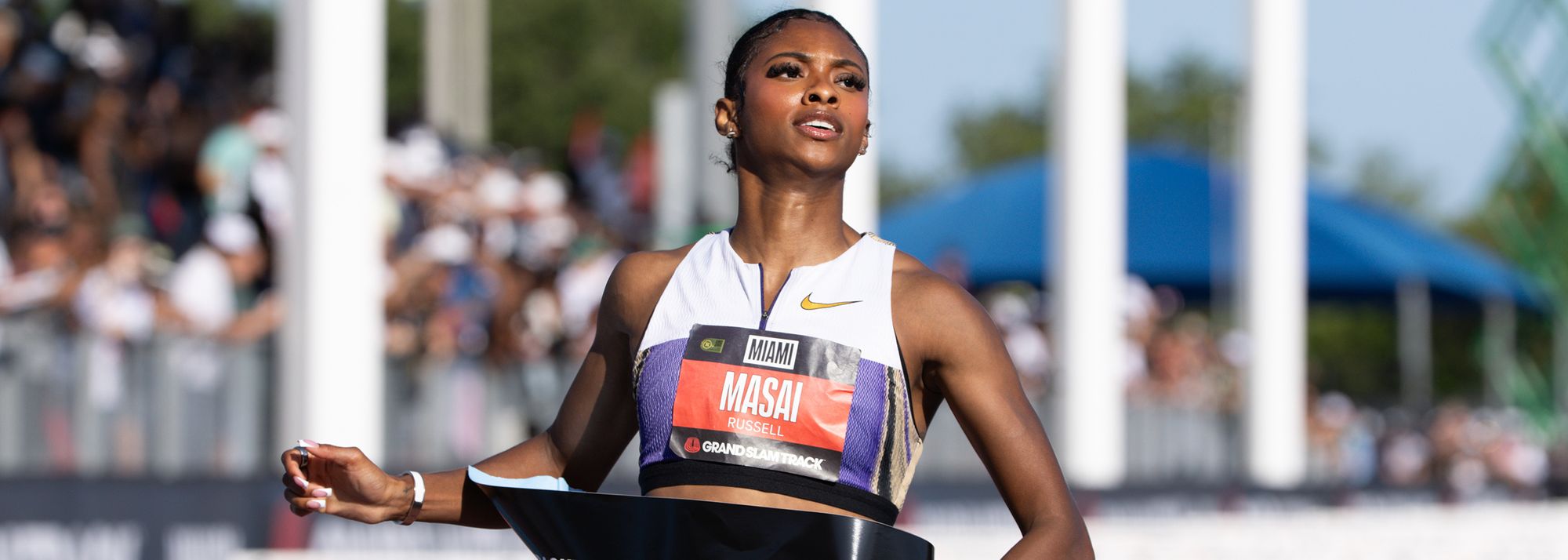 Masai Russell at the Grand Slam Track meeting in Miami (© Matt Pendleton for Grand Slam Track)