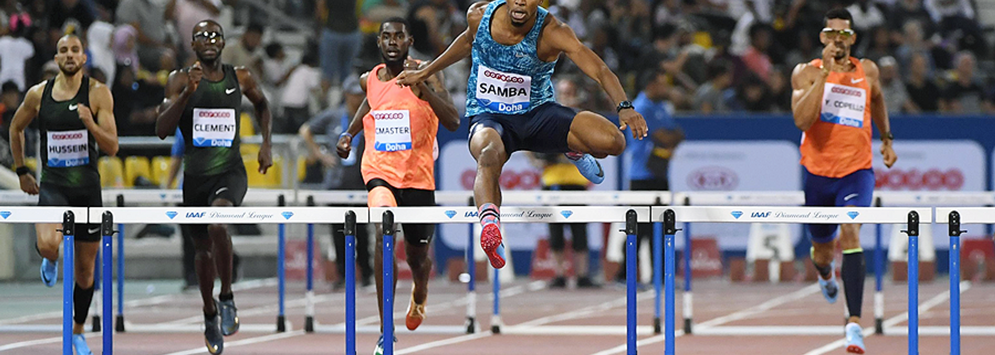 Abderrahman Samba wins the 400m hurdles at the IAAF Diamond League meeting in Doha (© Hasse Sjogren)