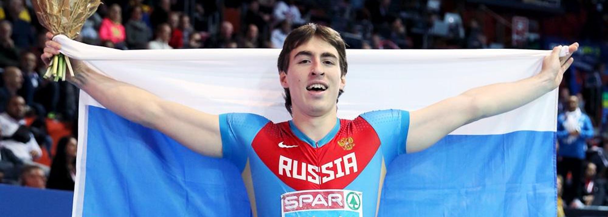 Sergey Shubenkov celebrates his 60m Hurdles victory at the European Indoor Championships (© Getty Images)
