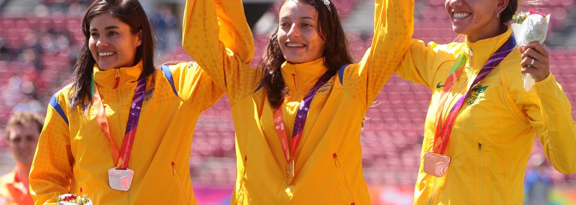 Sandra Arenas on the podium after winning the 20,000m race walk at the ODESUR Games (© Oscar Muñoz Badilla)