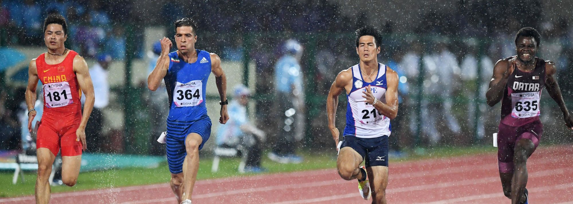 The ongoing rains and a pair of false start disqualifications hampered the men's 100m final, the evening-capping event, and in the end likely contributed to a minor upset. Hassan Taftian, Iran's national record holder at 10.04, held off Asian record holder Femi Ogunode by a scant 0.01 in 10.25 to capture his country's first title in the event.