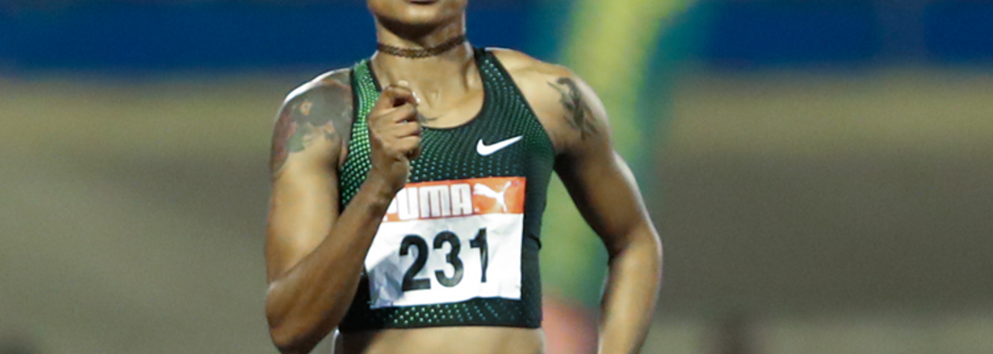 Elaine Thompson en route to her Jamaican 100m title (© Athelstan Bellamy)