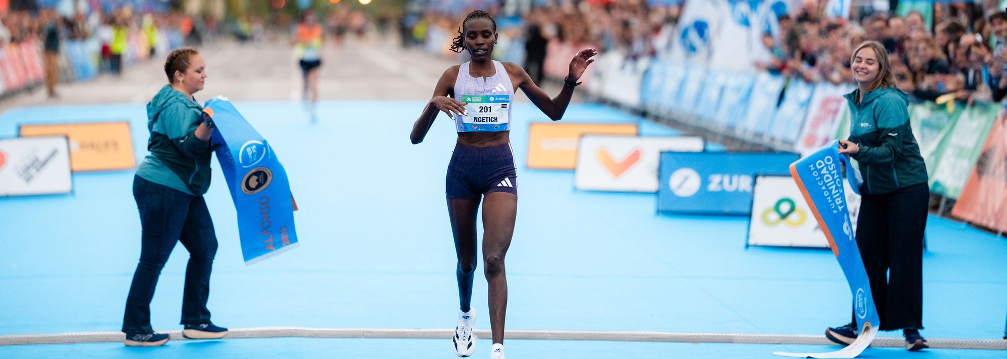 Agnes Ngetich set a world lead of 1:03:08 and Yomif Kejelcha clocked 58:02 to retain their titles at the Medio Maratón de Valencia Trinidad Alfonso Zurich, a World Athletics Gold Label road race, on Sunday (26).