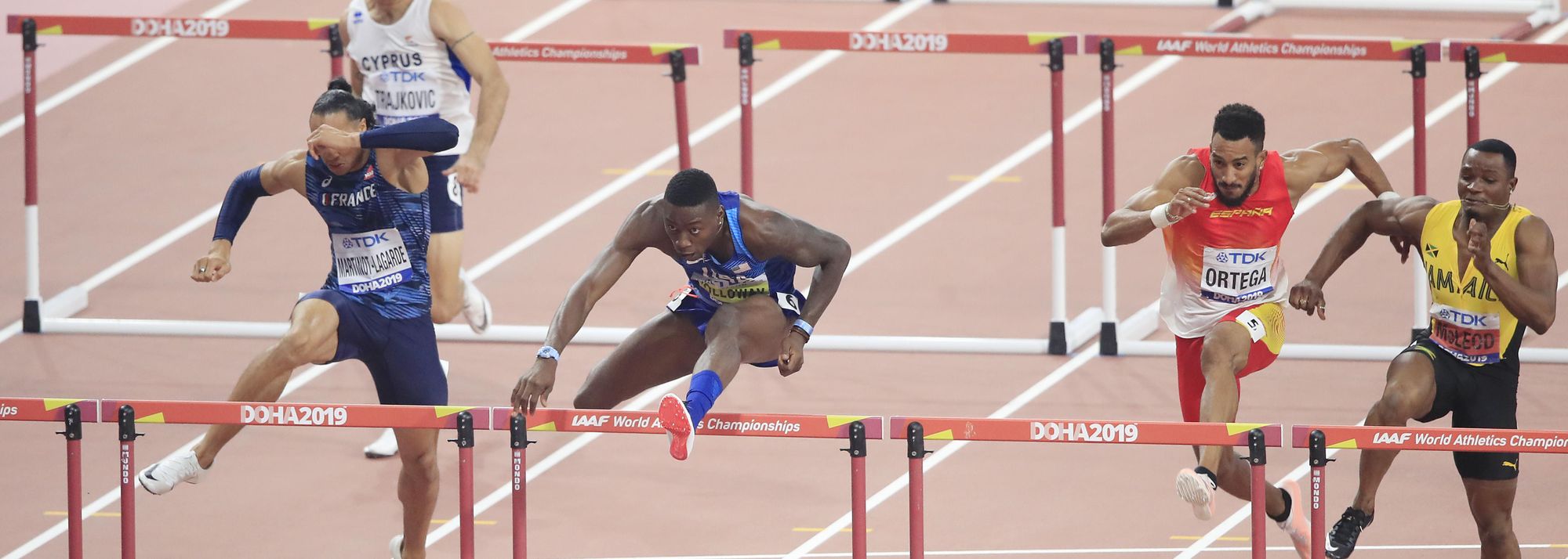 Grant Holloway of the United States marked his first season in the professional ranks with a 110m hurdles gold in 13.10 here at the IAAF World Athletics Championships Doha 2019, putting defending and Olympic champion Omar McLeod under such pressure that he crashed out of contention after hitting the last three hurdles with increasing force.