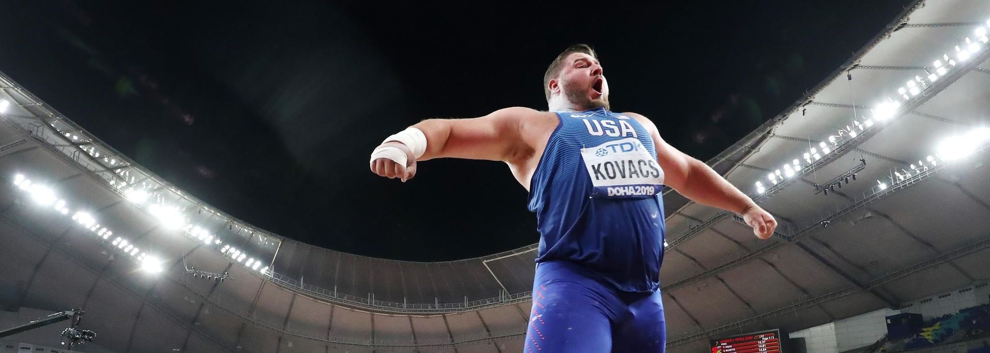 Joe Kovacs after unleashing his winning throw at the IAAF World Athletics Championships Doha 2019 (© Getty Images)