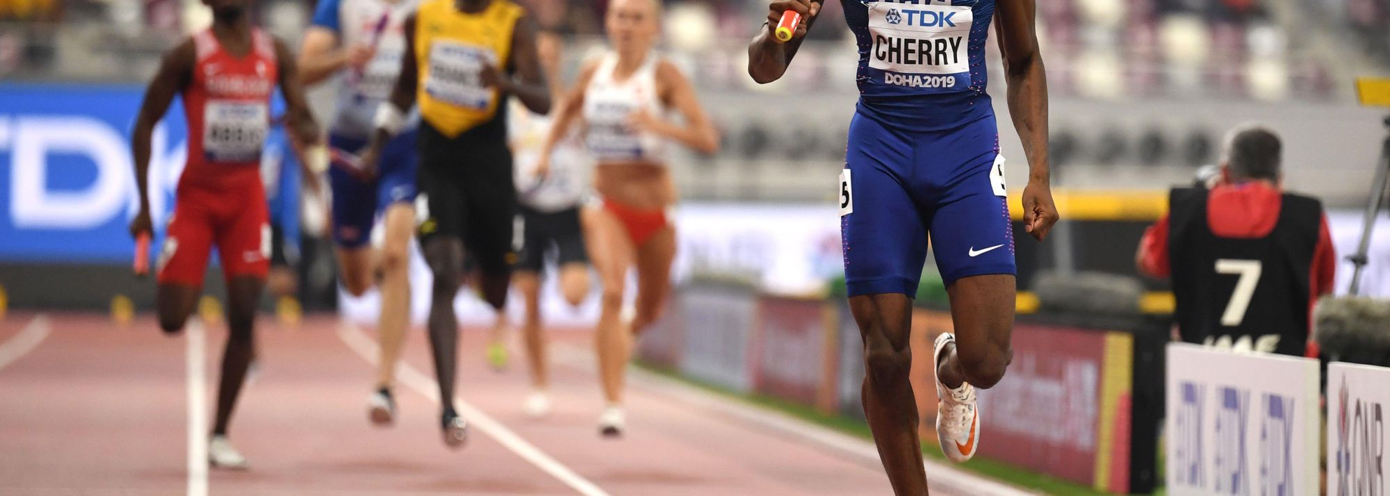 Michael Cherry anchors a USA quartet to a world record in the mixed 4x400m relay at the IAAF World Athletics Championships Doha 2019 (© AFP/Getty Images)