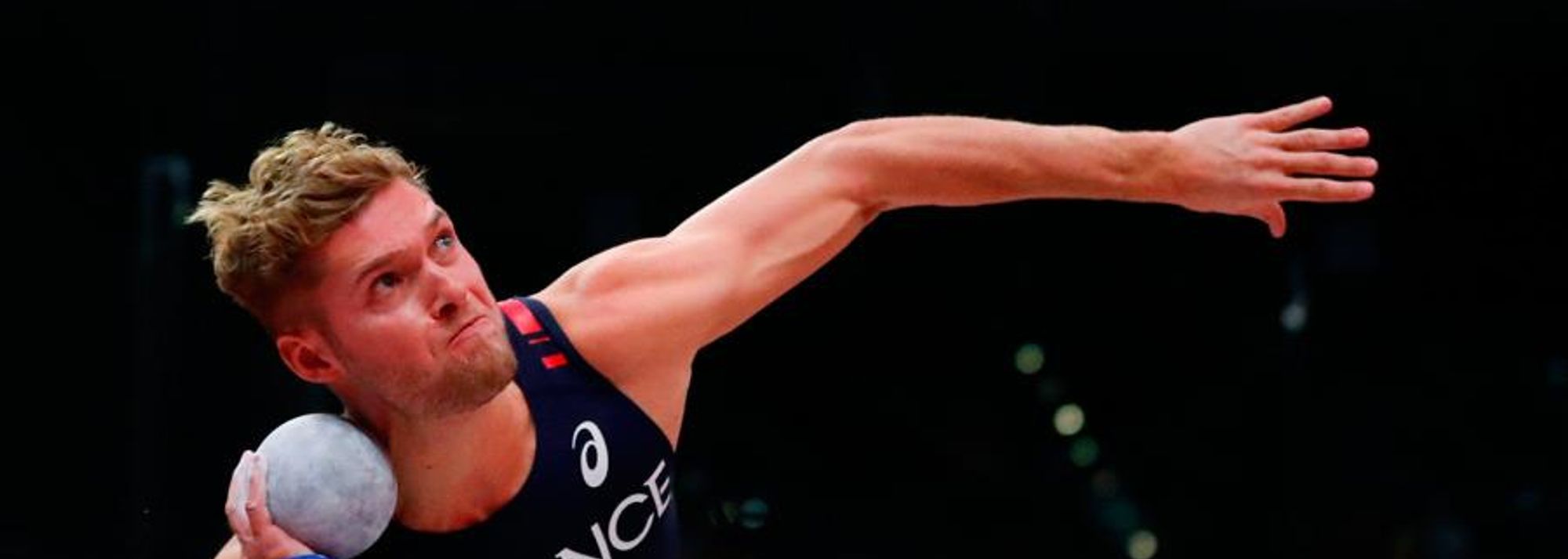Kevin Mayer in the heptathlon shot put at the IAAF World Indoor Championships Birmingham 2018 (© AFP / Getty Images)