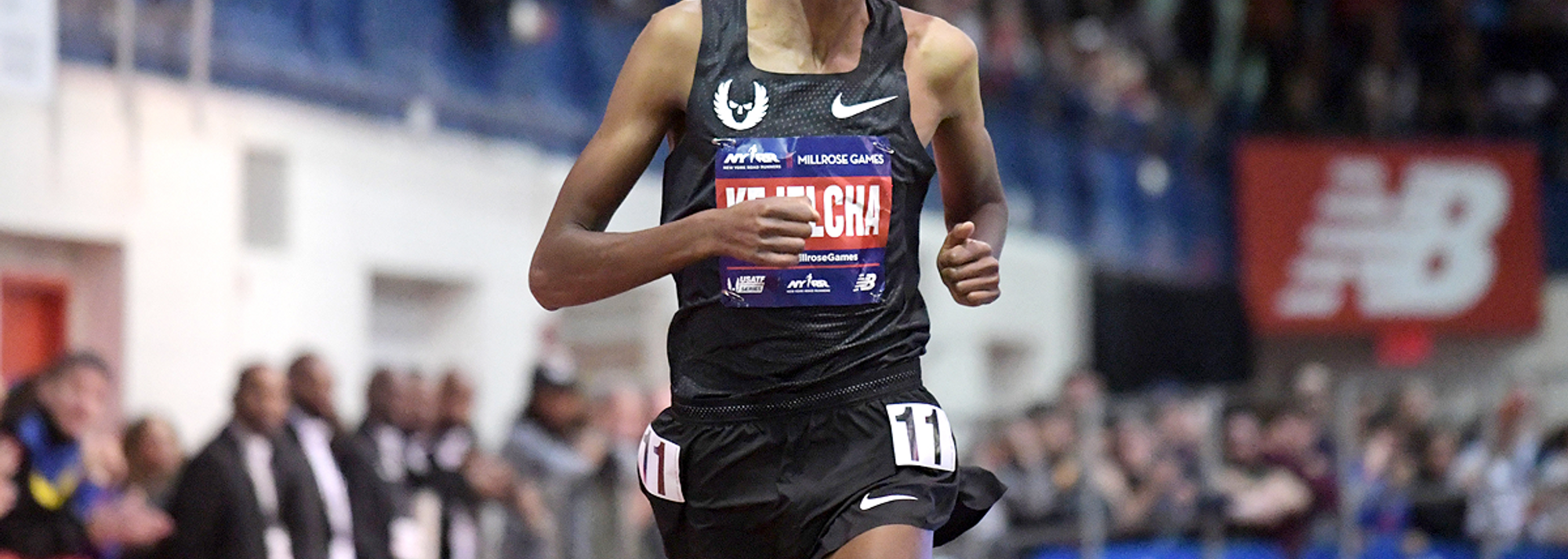 Yomif Kejelcha on his way to winning the mile at the Millrose Games (© Kirby Lee)
