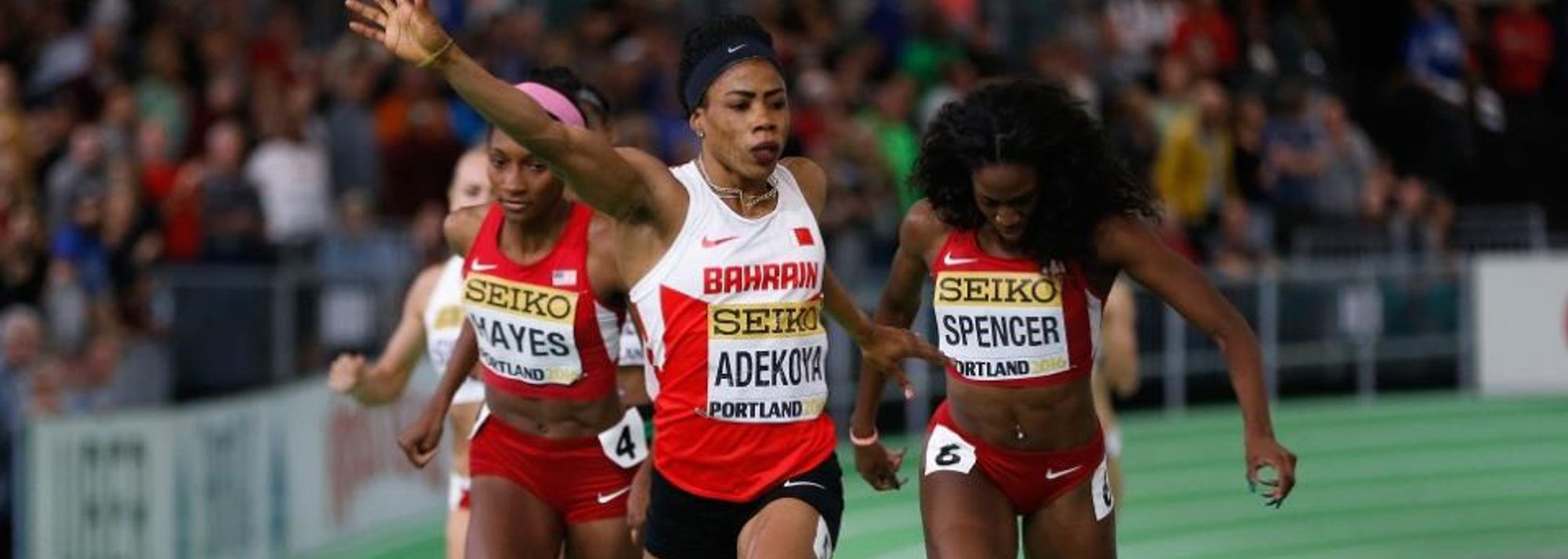 Kemi Adekoya wins the 400m at the IAAF World Indoor Championships Portland 2016 (© Getty Images)