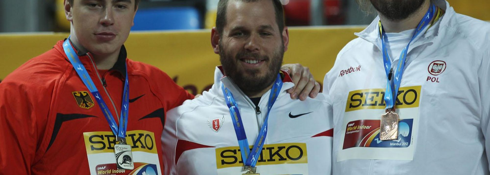 (L-R) Silver medalist David Storl of Germany, gold medalist Ryan Whiting of the United States and bronze medalist Tomasz Majewski of Poland stand on the podium during the medal ceremony for the Men's Shot Put during day one - WIC Istanbul (© Getty Images)