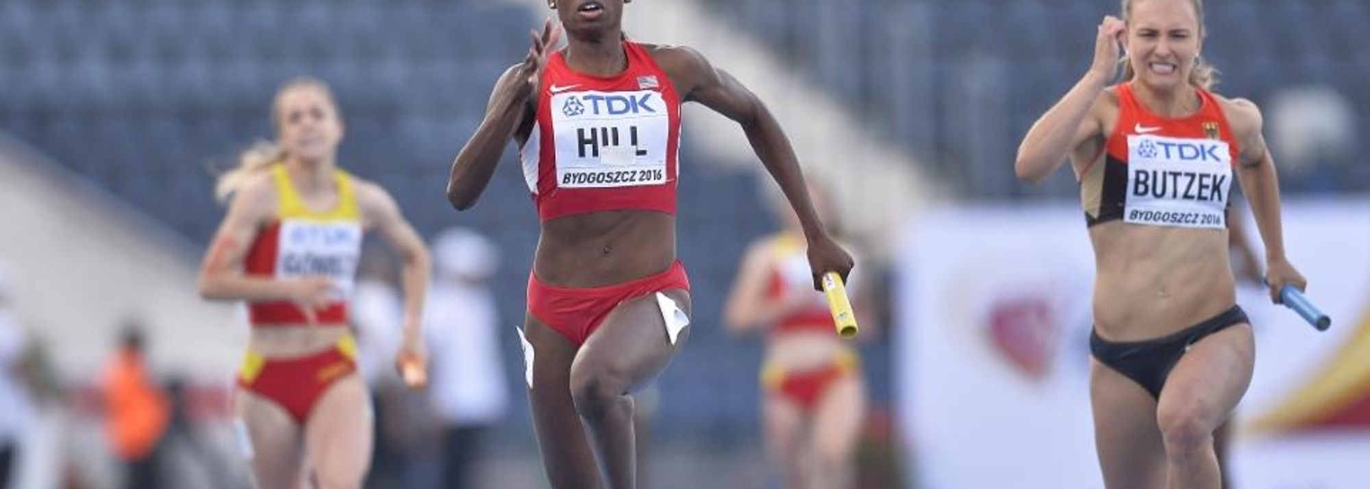 Candace Hill anchors the USA to gold in the 4x100m at the IAAF World U20 Championships Bydgoszcz 2016 (© Getty Images)