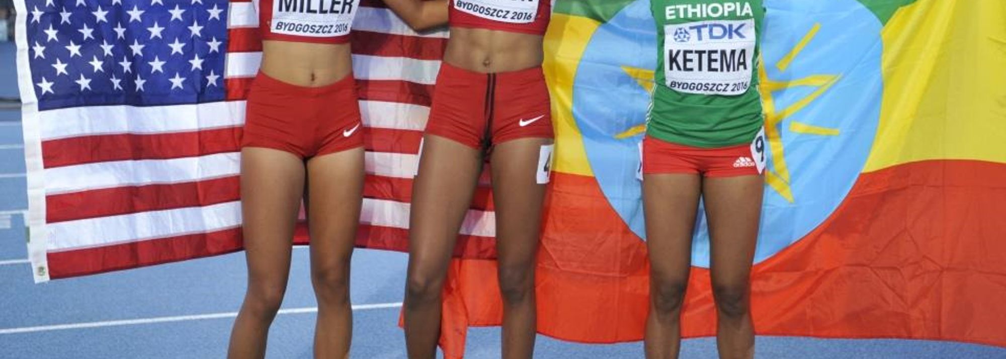 800m medallists: Aaliyah Miller (silver), Samantha Watson (gold)and Tigist Ketema (bronze) at the IAAF World U20 Championships Bydgoszcz 2016 (© Getty Images)