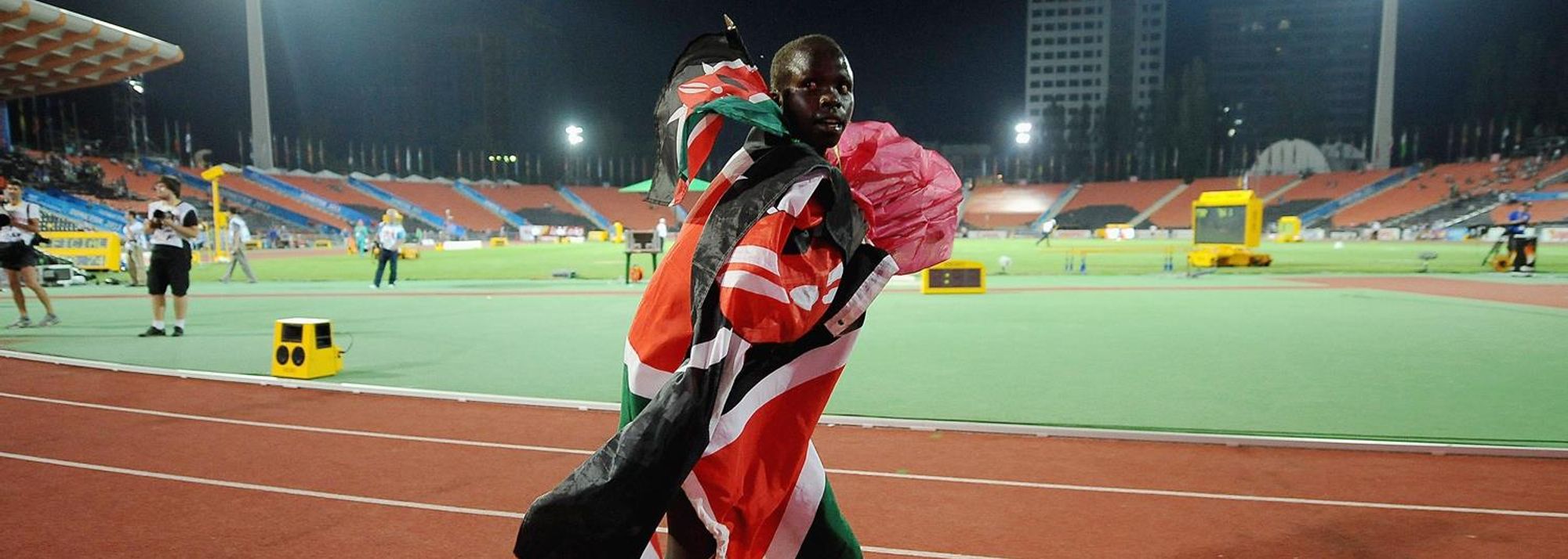 Lilian Rengeruk on her victory lap after winning the girls' 3000m at the World Youth Championships in Donetsk (© Getty Images)