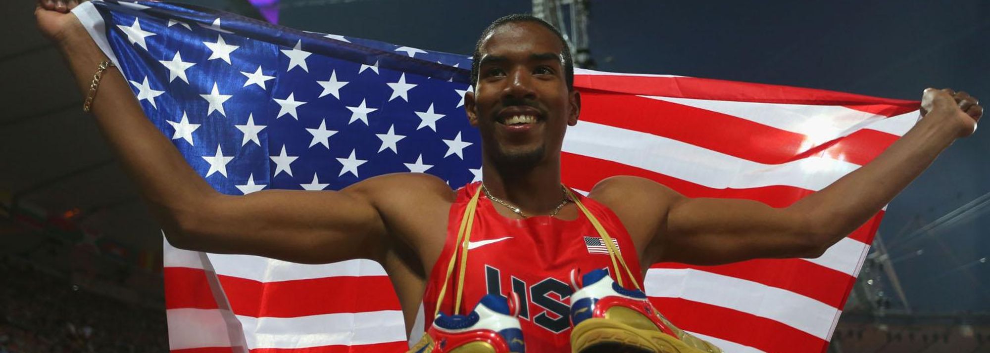 Christian Taylor celebrates after winning gold in the triple jump at the London 2012 Olympics (© Getty Images)