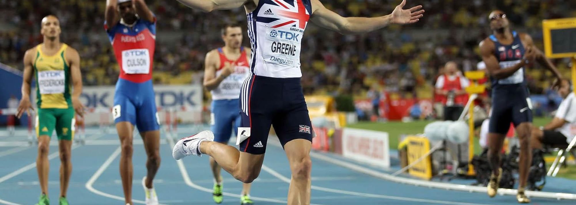 David Greene of Great Britain celebrates after crossing the finish line and claiming gold in the men's 400 metres hurdles final (© Getty Images)