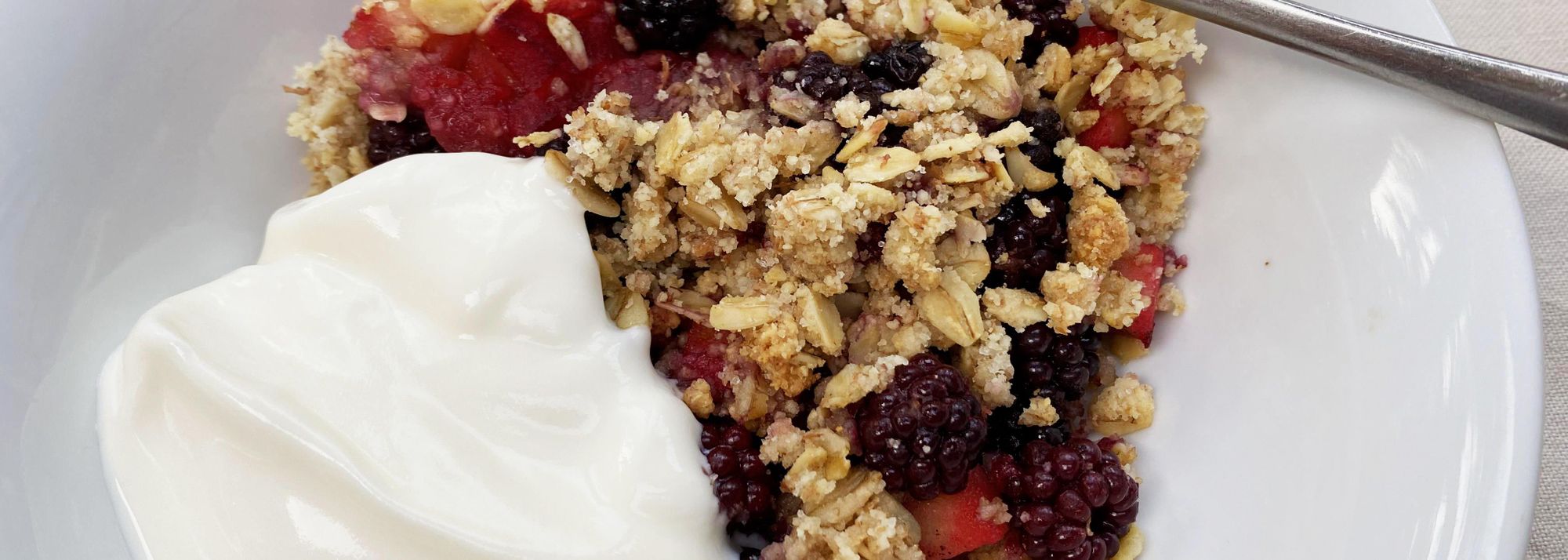 The best recipe for blackberries, without doubt, is crumble…a baked desert with fruit on the bottom and a crumbly sweet mixture on top. However, crumble has a lot of sugar in it, so it scores a bit of a black mark there. To remedy this, I have adapted the traditional crumble recipe into a healthier version – with wholemeal instead of white flour, oats to increase the fibre content, and much less sugar. I also add apples, the perfect Autumn companion to blackberries, cinnamon to add a little warmth and flavour, and ground almonds to add protein. You could also add a little desiccated coconut. It is delicious eaten hot with Greek yoghurt (or even ice-cream, if you dare!), or cold as a snack.