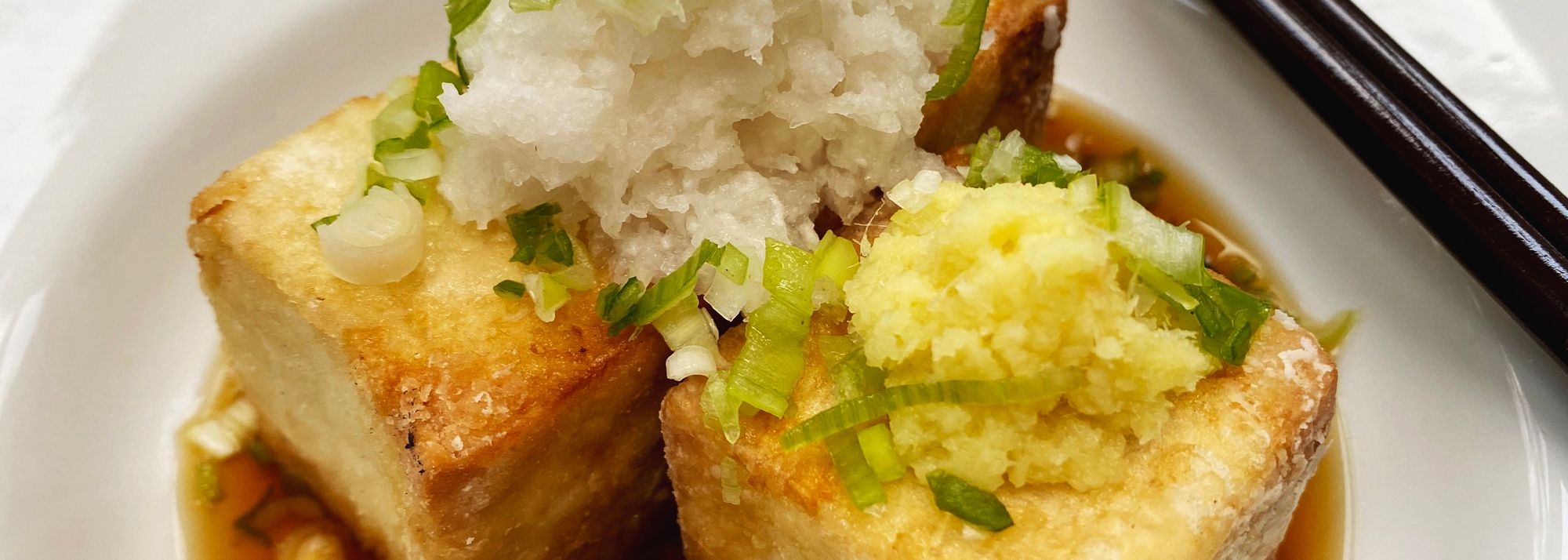 Having lived in Japan for many years, I became a fan of soya products such as edamame beans, tofu and miso. Soya products are a good protein source which are an alternative to meat. One of my all-time favourite soya dishes is agedashidofu – crispy fried tofu served with a delicious sauce and condiments on top. The hot sauce softens the tofu and makes for a warming and satisfying, yet simple dish.