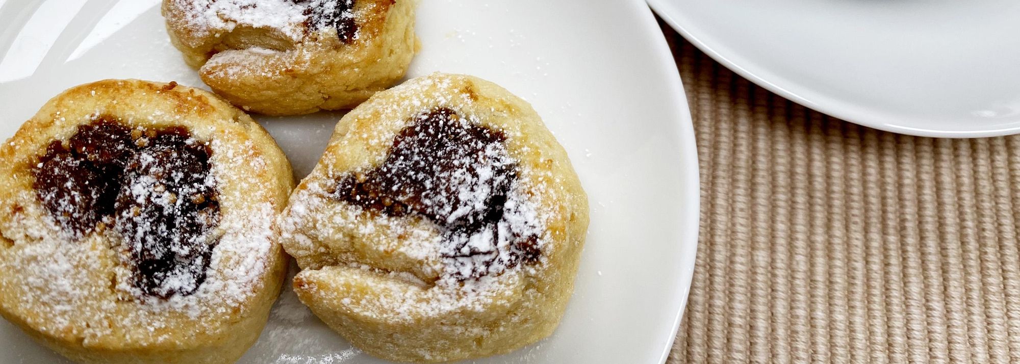 • On a floured rolling sheet or baking parchment, roll the pastry out into two rectangles, about 25cm long and 10cm wide. Carefully add the fig paste in a strip lengthways on each rectangle, about 3cm in from one edge. Wet the other edge of the pastry using your fingers dipped into water. Then using the rolling sheet, parchment or the edge of a long knife, carefully roll the edge of the pastry nearest the filling over the top of the filling and keep rolling until the entire rectangle has become a roll. Repeat for the other rectangle.