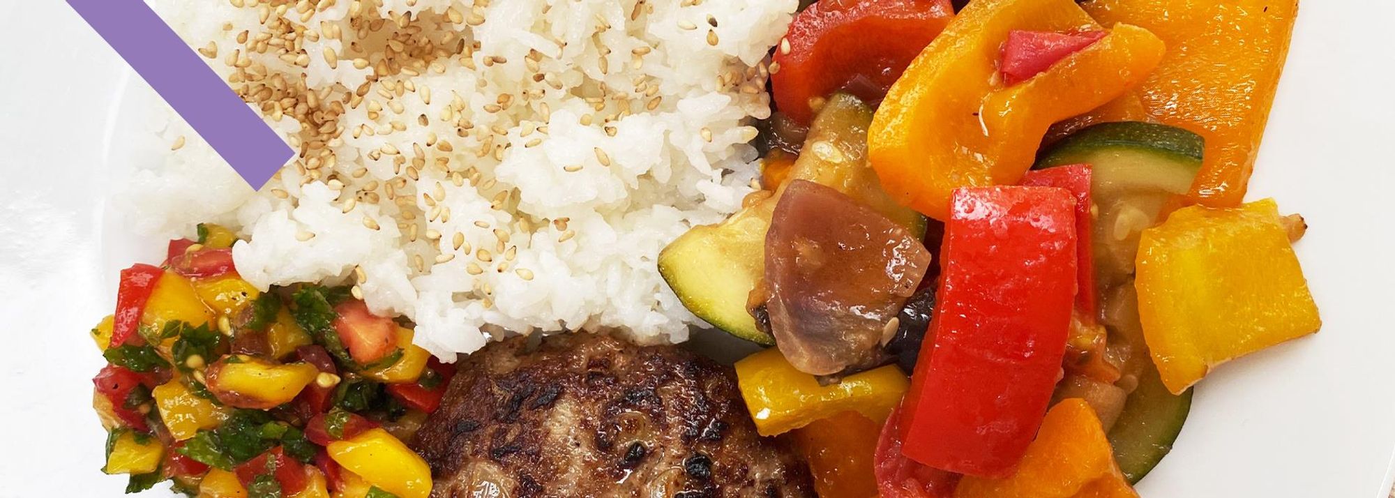 • I like eating burgers with rice and vegetables, with a sauce on the side (in this case salsa, but you could use any sauce that you like). These burgers are also delicious eaten in the traditional way, sandwiched in a toasted burger bun with melted cheese, pickles, tomato, lettuce, and ketchup.