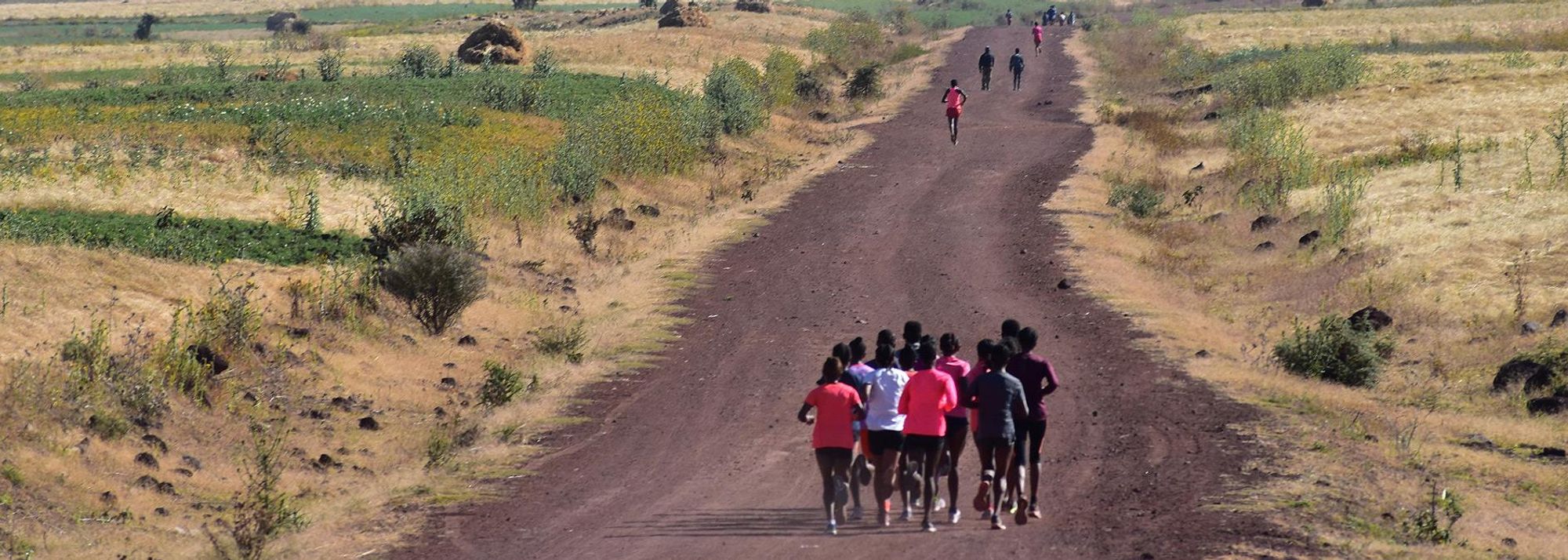 A group of athletes run through Sendafa (© Cathal Dennehy)