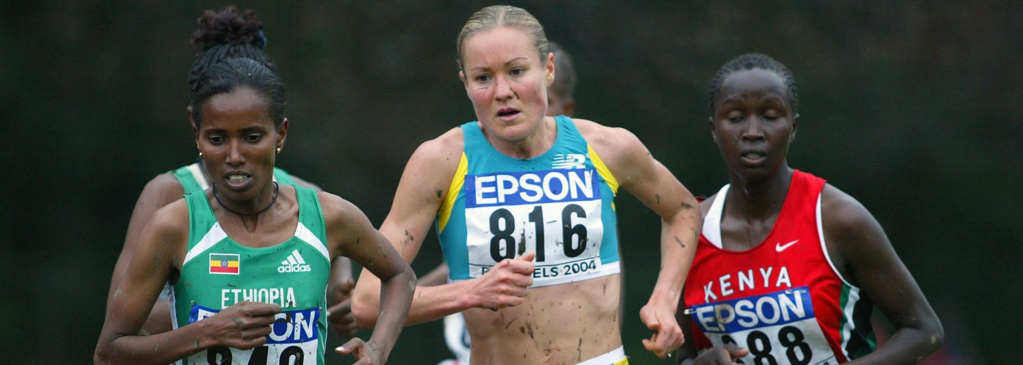 Benita Willis (c) en route to the 2004 world cross country long course title in Brussels (© Getty Images)