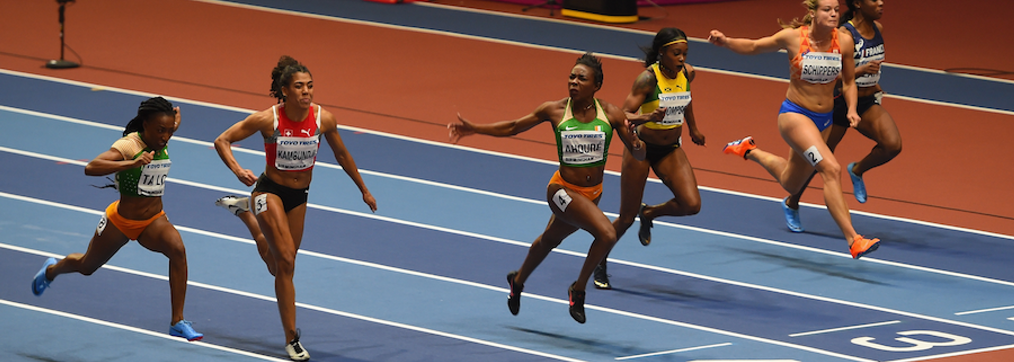 Lead image: Sprinter Murielle Ahoure secures a 60m gold ahead of Ivory Coast teammate Marie-Josee Ta Lou. Ahoure had twice won silvers in the event coming to Birmingham, and dedicated her win to her father, who died last year.