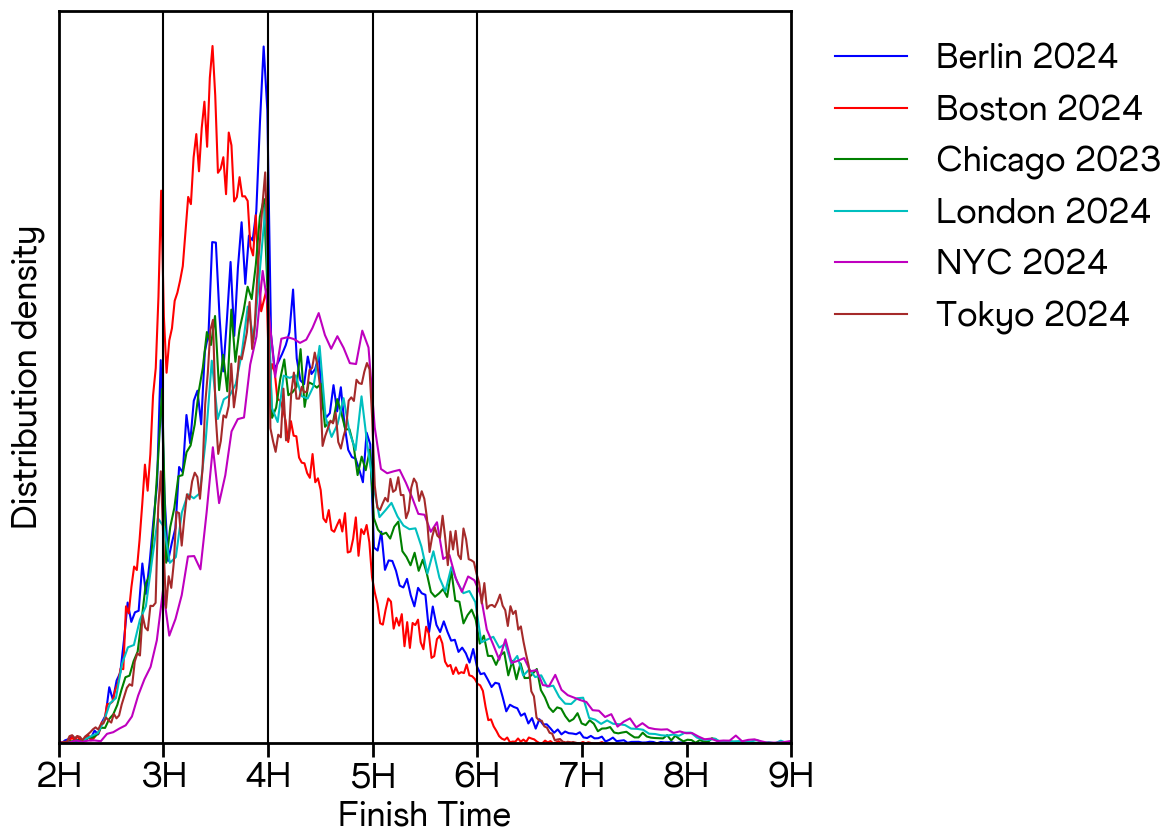 The vertical lines on the graph show common time barriers (3:00, 3:30, 4:00, etc.) that runners typically aim for. These barriers create noticeable peaks in the distribution, with the most pronounced peaks appearing in Boston, Berlin, and Chicago. In contrast, the NYC Marathon shows a more continuous time distribution, suggesting it's not the ideal course for achieving personal best times.