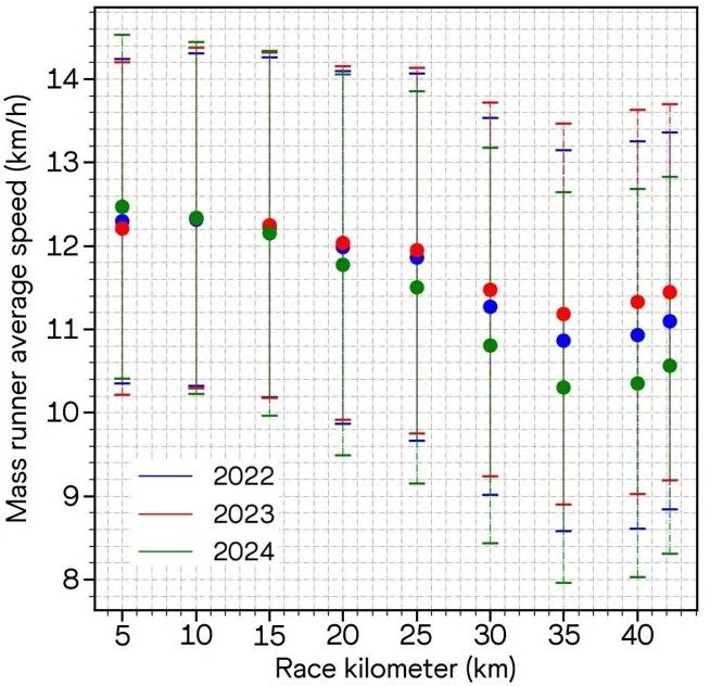 With the same course profile for all three races, the climate's effect is clear. Starting from the halfway point in 2024, most runners experienced a significant speed decline compared to previous editions. Higher temperatures caused an average running speed difference of more than 0.5 km/h between 2023 and 2024. Drier conditions led to a maximum decrease of 0.3 km/h between 2022 and 2023. Rather than adopting more positive split strategies, runners experienced a complete performance breakdown.