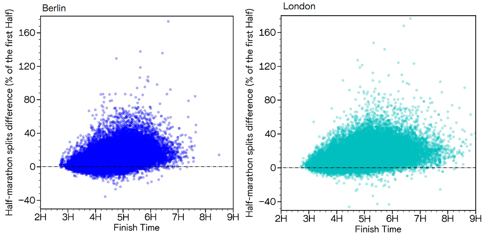 Figures: Percentage difference between the second and first half-marathon times as a function of finish time. The black dashed line indicates equal splits—above shows positive splits, below shows negative splits.