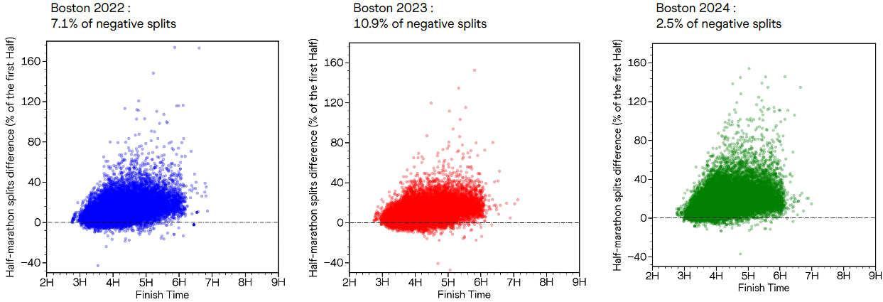 Figures: Percentage difference between the second and first half-marathon times as a function of finish time for the three last editions of the Boston marathon (respectively 2022, 2023 and 2024). The black dashed line indicates equal splits—above shows positive splits, below shows negative splits.
