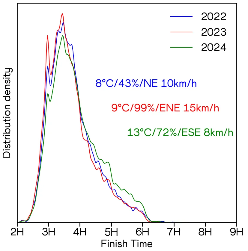 Figure: Distribution of finish time in Boston marathon in 2022, 2023 and 2024 with climate conditions at start: temperature, humidity and wind direction and intensity.