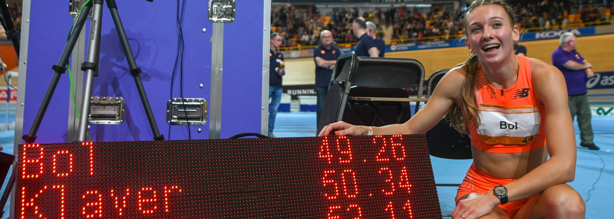 In Apeldoorn, Bol got a typical strong start and went through 200m in 23.63 before surging over the finish line in 49.26, chased by her training partner Lieke Klaver who was second in big indoor PB of 50.34.